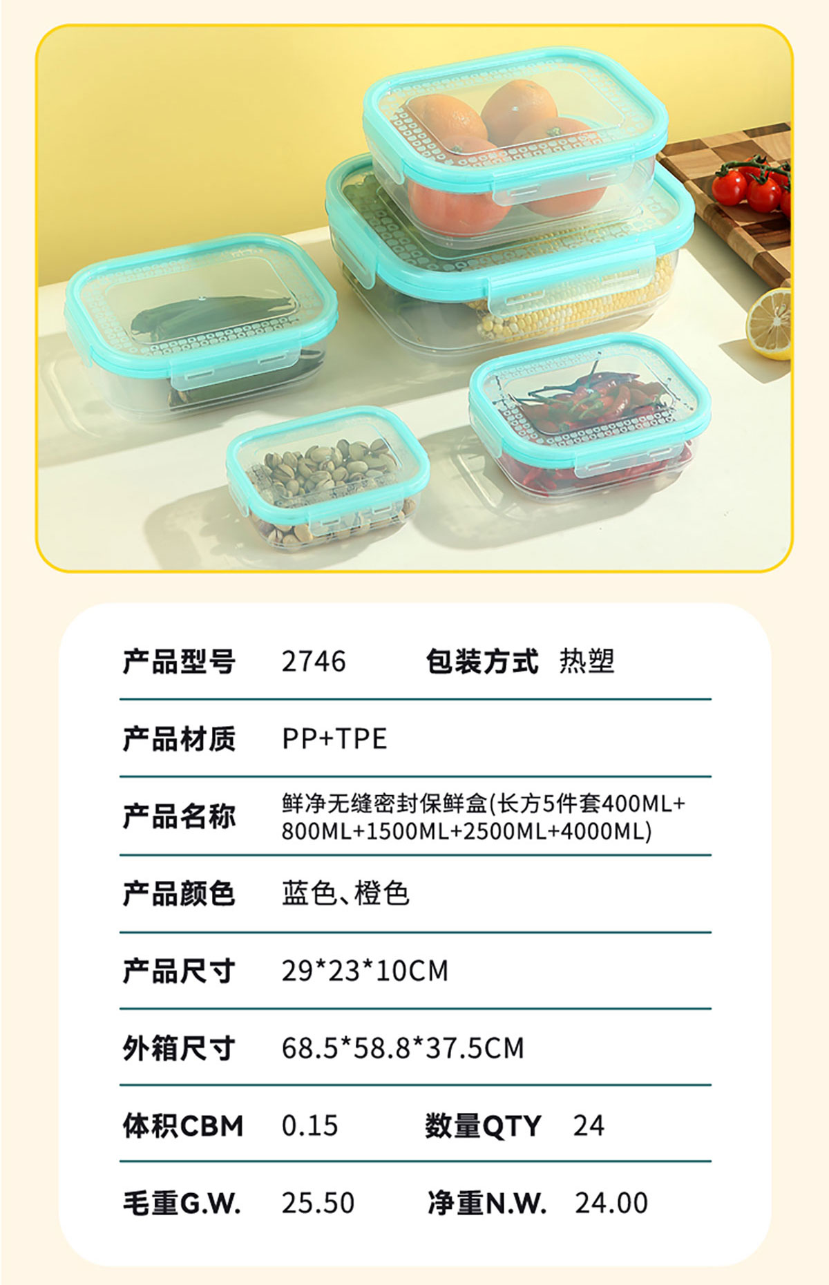 AQX-2746:290*230*100mm/長方5件套400ml+800ml+1500ml+2500ml+4000ml